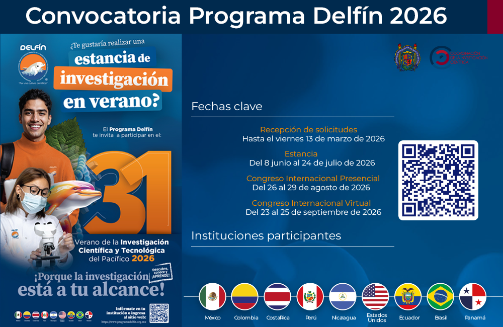 Se invita a los estudiantes interesados a realizar su registro y participar en el Verano Delfín 2026. Este programa ofrece a estudiantes de licenciatura la oportunidad de incorporarse a proyectos de investigación científica y tecnológica, bajo la asesoría de investigadores de reconocido prestigio, fortaleciendo su formación académica y su desarrollo profesional.